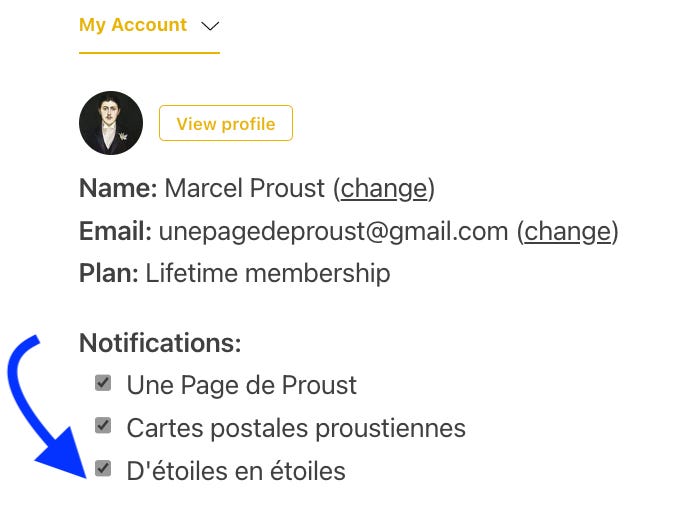 Si toutefois vous préféreriez ne pas les recevoir, il vous suffit de cliquer ici (sur votre compte Substack) et de décocher la rubrique “D’étoiles en étoiles”